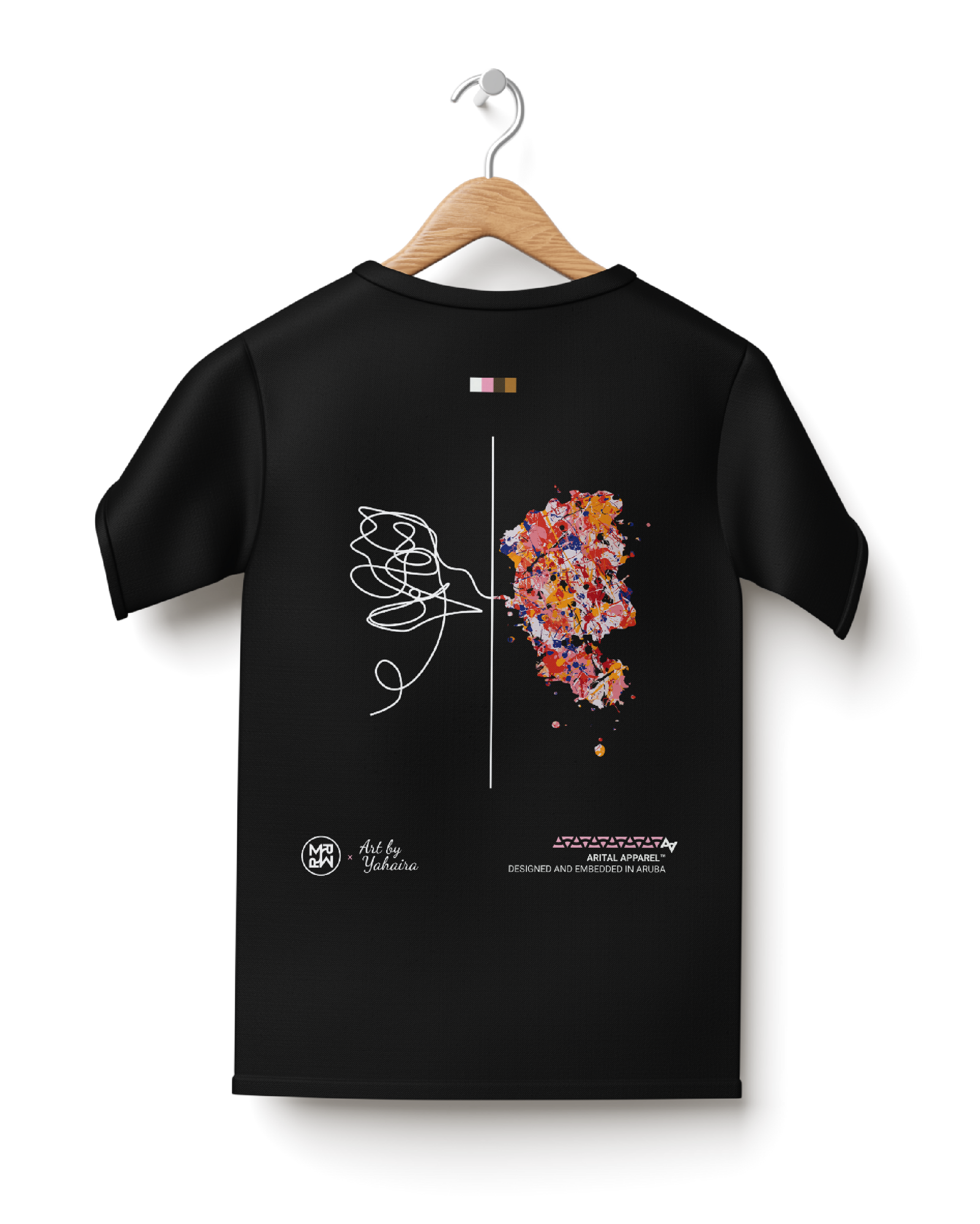 Inspired by the blurred lines between thought and creation, "Presencia" brings together the vision of Arital Apparel, Maison Ryon, and Art by Yahaira. The left side of the design unfolds as line art, reflecting the structure of the mind, while the right side bursts into Yahaira’s vibrant splatter, a raw canvas of expression. "Presencia" is a reminder that the mind alone is not enough; true presence is found when ideas meet expression. All wearable art pieces are designed and embedded in Aruba.